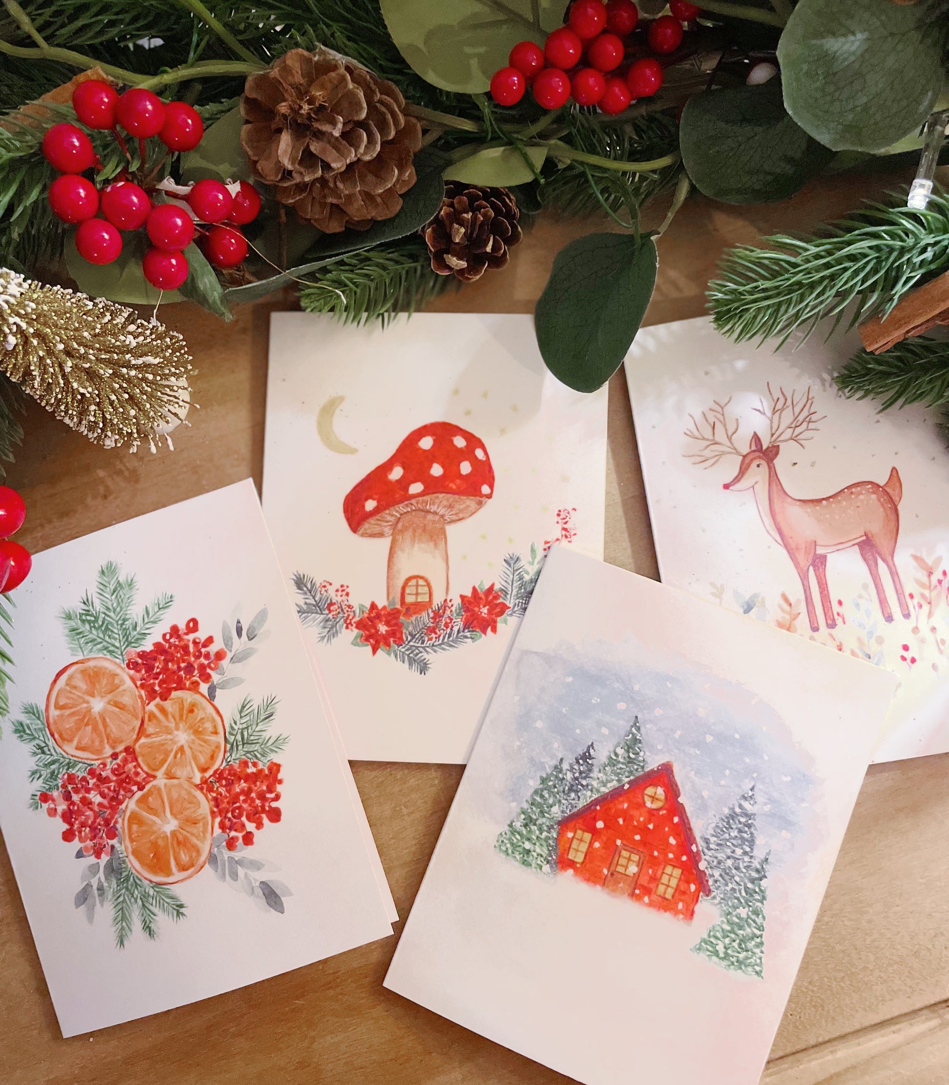 - 1 Carte de souhaits peinte à l'aquarelle du temps des Fêtes (reproduction).